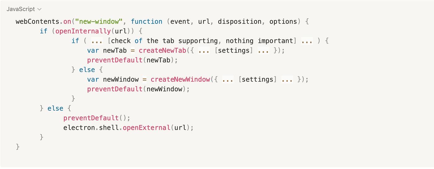 webContents.on("new-window", function (event, url, disposition, options) {}
